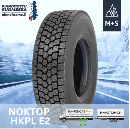 oko: 315/60R22.5, 315/70R22.5, 315/80R22.5, 295/80R22.5 Akseli: Vetävä Pinnoitus: Suomessa, valikoidulle 1-rungolle (esim. Michelin, Bridgestone, Goodyear, Continental) Valmistajan sivu: Nokian Renkaat – Noktop Hakkapeliitta E2 Kuvaus: Nokian Hakkapeliitta E2 on Suomessa valmistettu ja Suomessa pinnoitettu huipputason talvipinta vetäville akseleille. Syvä, avoin kuviointi ja tappilamellointi takaavat varman otteen lumella ja jäällä, samalla kun matala vierintävastus parantaa polttoainetaloudellisuutta. Ominaisuudet: 3PMSF-sertifioitu talvipinta Tappilamellointi ja toisiinsa kytkeytyvät kuviopalat Vähentää lumiketjujen tarvetta Alhainen vierintävastus ja hiljainen ajoääni Valmistettu ja pinnoitettu Suomessa, yhteistyössä pinnoittamo.fi kanssa Soveltuvuus: Ihanteellinen valinta pohjoisiin olosuhteisiin, joissa vaaditaan maksimaalista pitoa ja luotettavuutta – myös huonokuntoisilla teillä. Myös asiakkaan omaan runkoon pinnattuna, ksyy tarjous!